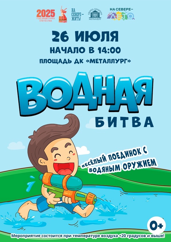 На площади Дворца культуры «Металлург» — долгожданная водная битва, в которой может принять участие любой желающий, имеющий в арсенале водяные пистолеты, автоматы, «капитошки», «бутылки-стрелялки»… — в ход пойдет все!